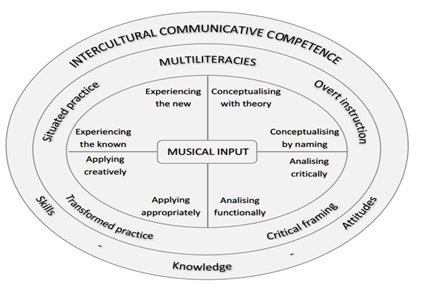 Fernández García (2024) propone un enfoque basado en el uso de la música en un contexto multilingüe de aprendizaje de Inglés como Lengua Extranjera (ILE) que pueda servir como guía para facilitar la CCI del alumnado, además de proporcionar algunas sugerencias pedagógicas (ver Figura 1). Como eje principal se han tenido en cuenta los componentes curriculares de la Pedagogía de las Multiliteracidades. De esta manera, en la primera fase de experimentación se parten de recursos culturales, en este caso input audiovisual, para involucrar a los estudiantes en actividades comunicativas interculturales por medio de, por ejemplo, las letras de los himnos nacionales, como análisis de estereotipos culturales o debates sobre el papel de la cultura en la lengua meta en comparación con la cultura de los estudiantes. Posteriormente, la fase de Instrucción Abierta o conceptualización, supone la construcción de conocimiento enfocándose en la propia cultura y la cultura de los demás. Una actividad podría ser introducir y discutir costumbres de distintas culturas. Por ejemplo, el concepto de malhun en la cultura marroquí se refiere al canto poético utilizado por los artesanos. En el sur de España, hay diferentes canciones tradicionales como las coplas andaluzas o los cantes de trilla, que representan temas cotidianos. En el caso de los países de habla inglesa, la música country puede proporcionar a los estudiantes una amplia gama de conceptos culturales relacionados con elementos de una variedad lingüística de Estados Unidos, como el twang o el drawl .
