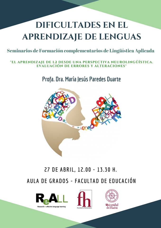 El pasado 27 de abril celebramos nuestro I Seminario de Dificultades en el aprendizaje de lenguas. La profesora Dª María Jesús Paredes Duarte nos habló del Aprendizaje de una L2 desde una perspectiva neurolingüística.